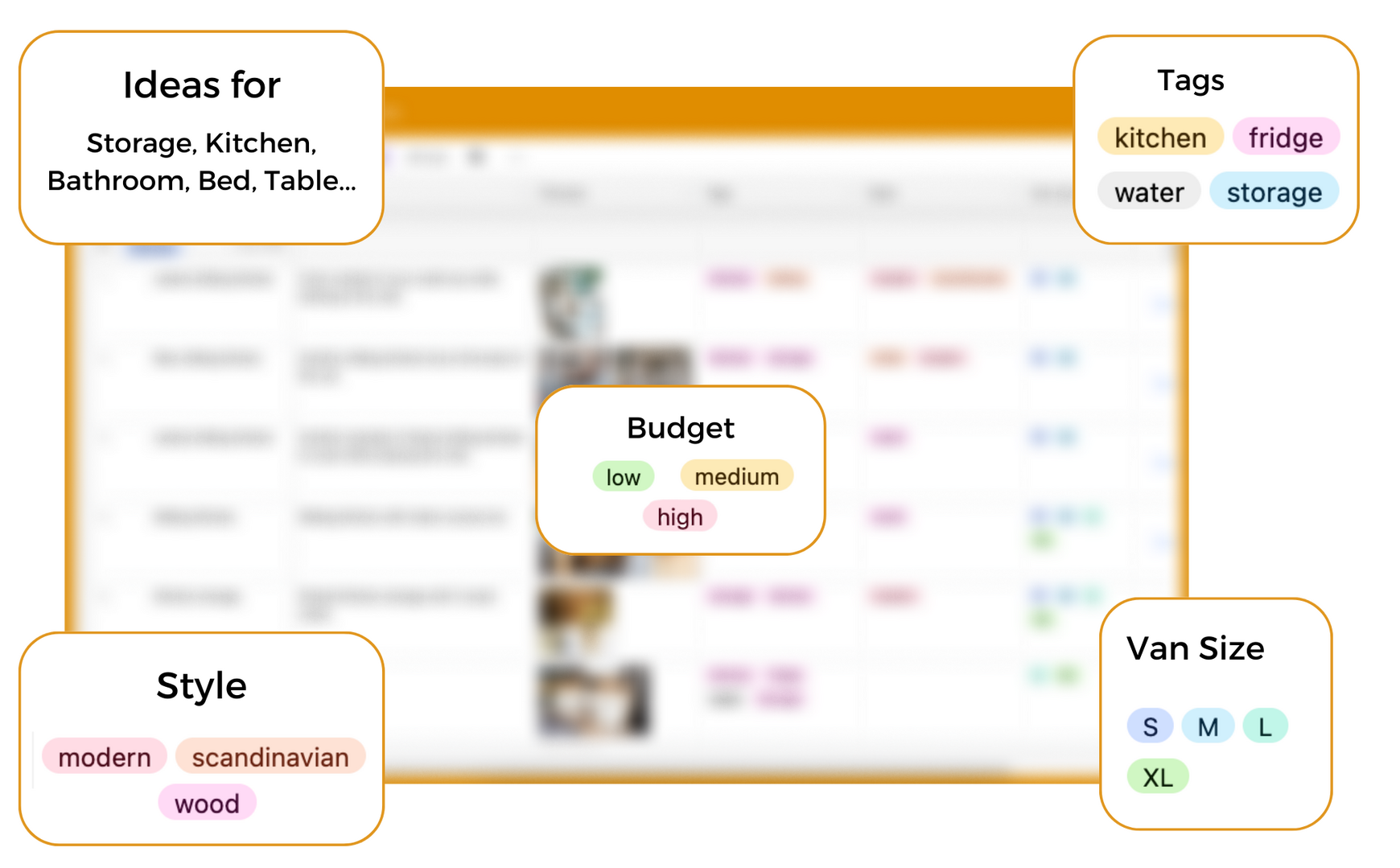 I searched for ideas on how to layout my van, where to put the kitchen, the bed, and a table... I created an Airtable base with all the best ideas I could find. And now, I'm sharing it with you. 👍